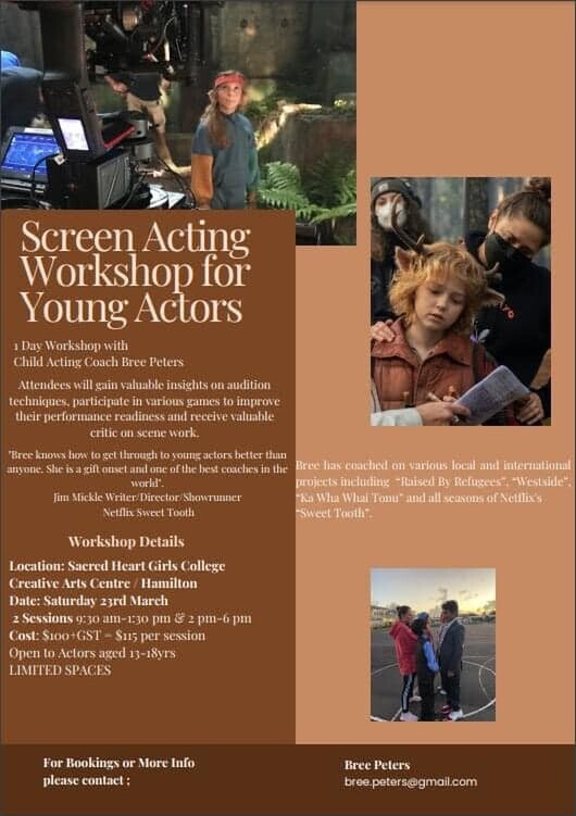 Mark Saturday 23rd of March in your calendar as Bree Peters will come to Hamilton to host two Screen Acting Workshops for Young Actors.